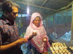 Dr. David Pahan, Country Director of Lepra Bangladesh, talking with Maksuda about her poultry farm.